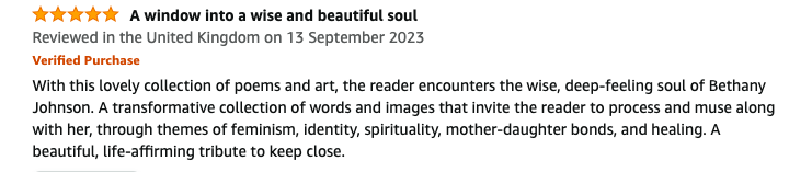 Assembled by her mother after Bethany's death, this precious book is something to hold close.A treasury of poems and art, from the wise, loving soul of Bethany Johnson. The poetry lovingly explores themes of healing, kindness, feminism, identity, spirituality, and the precious family bonds of mother, child and brother.